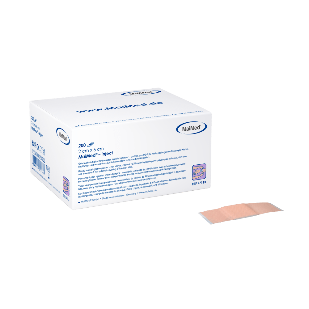 Die MaiMed-inject Injektionspflaster sind die ideale Wahl für alle, die Wert auf Hygiene und Schutz legen. Diese wasserfesten Pflaster bieten eine ausgezeichnete Haftung und verhindern das Eindringen von Schmutz und Feuchtigkeit in die Wunde. Sie sind besonders hautfreundlich und lassen sich schmerzfrei entfernen, ohne Rückstände zu hinterlassen. Perfekt für den Einsatz in medizinischen Einrichtungen oder für die häusliche Pflege.